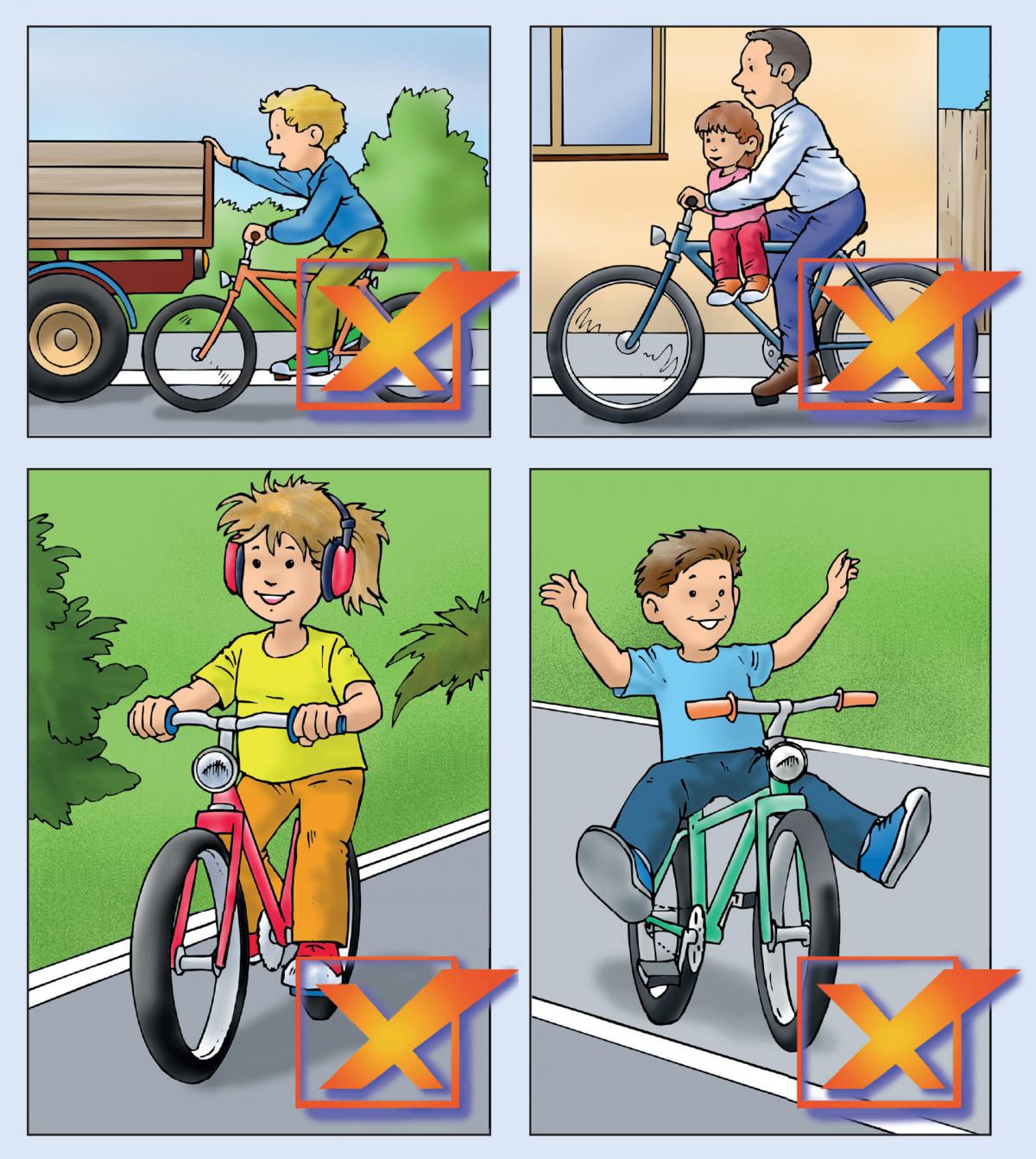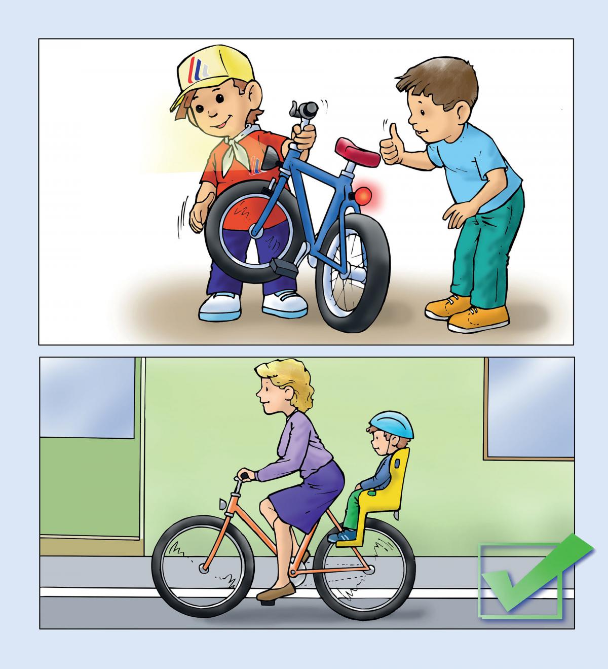 Бицикл мора да буде исправан, а посебно морају да буду исправни предње и задње светло. Када вас мама или тата возе на бициклу, увек морате седети у посебном седишту.